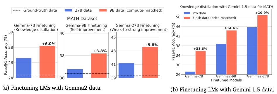 They finetuned Gemma-7B, 2-9B, and 2-27B on synthetic data collected from both a stronger but more expensive LM (Gemma2-27B) and a weaker but cheaper LM (Gemma2-9B) in a compute-matched setup for the MATH dataset. They found that training with Gemma2-9B data is more compute-optimal across diverse fine-tuning paradigms—knowledge distillation, self-improvement, and weak-to-strong improvement (i.e., using a weaker model to improve a stronger model).